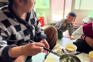 女子正在吃饭,结果儿子一个侧空翻差点把她的碗踢掉